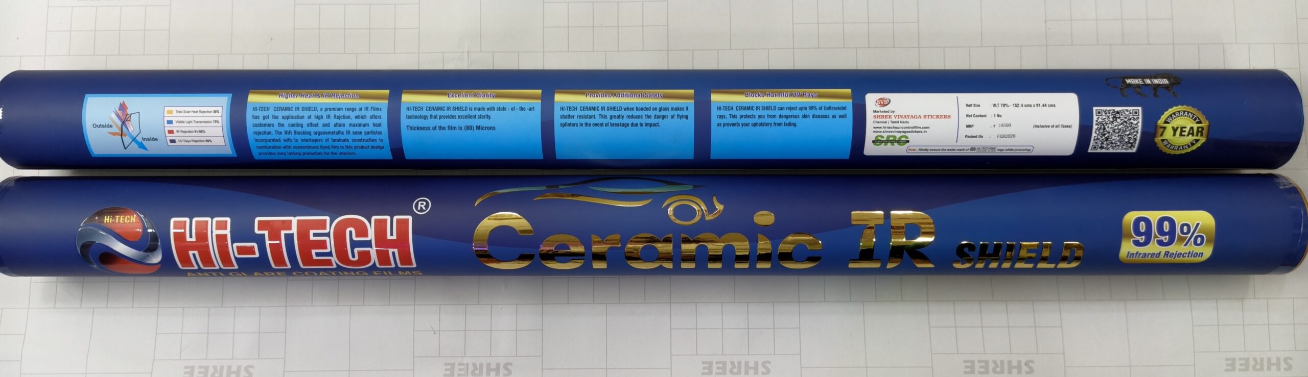 NENO CERAMIC IR FILM a premium range of sun control films for automobiles that offer high heat rejection and a cooling effect. The films are made with NIR blocking organometallic IR nano particles in the laminate construction and conventional dyed film. They are designed to protect the car’s interior and offer the following featuresHITECH CERAMIC IR Windshield sun control film with highest heat rejection froHITECH offering 99% Infrared Radiation Rejection and Heat Rejection 60%. It safeguard the interiors by preventing 99% UV rays from sun light also having highest glare reduction in this CERAMIC IR SHIELD Sun film with 70% Visibility.